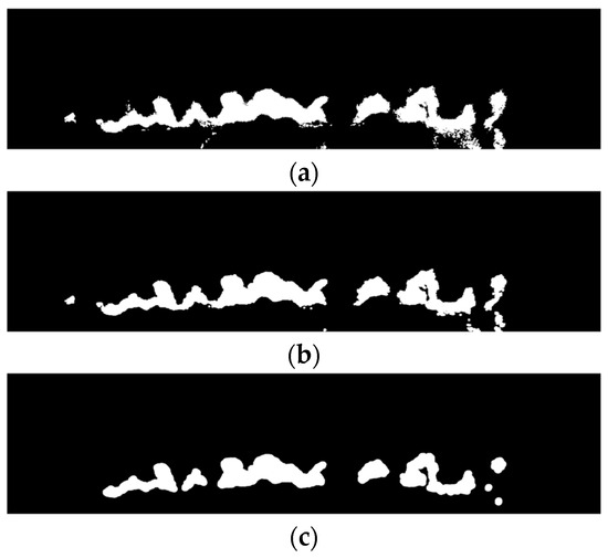 Effect diagram of cross-section image opening operation; (a) Original binary image; (b) Effect drawing of opening operation of the structural element with a radius of 5; (c) Effect drawing of opening operation of structural elements with a radius of 30.