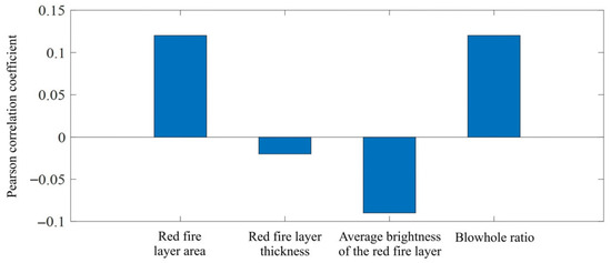 The Pearson correlation coefficient calculation results of image features are shown in Figure 11. It can be seen that the linear relationship between the thickness of the red fire layer and the FeO content of sinter is not obvious.