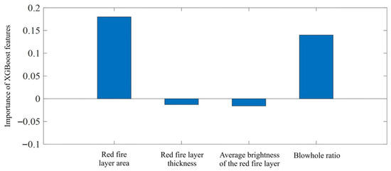 Generally, it is considered that the absolute value of a correlation greater than 0.75 is a strong correlation, and less than 0.09 is irrelevant. Therefore, after removing data with linear correlations and absolute values of feature importance less than 0.09, the image parameters finally extracted in this paper are the red fire layer area and blowhole ratio.