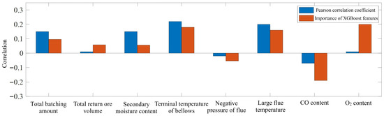 Pearson linear correlation analysis and XGBoost feature importance analysis were also carried out for process parameters, and the results are shown in Figure 13.