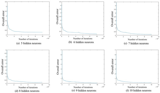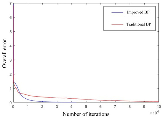 In order to compare the traditional BP neural network with the adaptive learning rate method and the improved BP neural network with additional momentum terms, the weights and thresholds in the BP neural network are initialized to 0, the maximum number of iterations is 100,000, the overall error requirement is 0.01, the initial learning rate is 0.9, and the activation function is the sigmoid function.