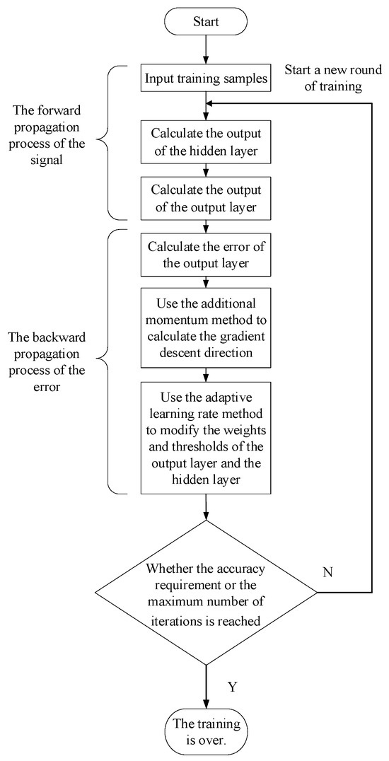 Since the adaptive learning rate method can reduce the number of iterations during network training, and the additional momentum method can ignore the shallow local extreme points, the two methods can be combined to improve the prediction accuracy and the convergence speed of the BP neural network model. The improved BP neural network training process is shown in Figure 15.