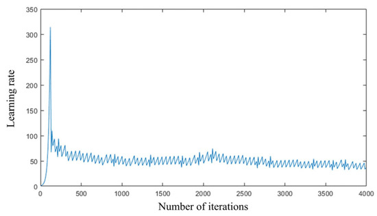 The training set in the sample set is used to train the traditional BP neural network with the structure of 8-9-1 and the improved BP neural network, respectively. The change in the learning rate of the improved BP neural network in the training process is shown in Figure 16.