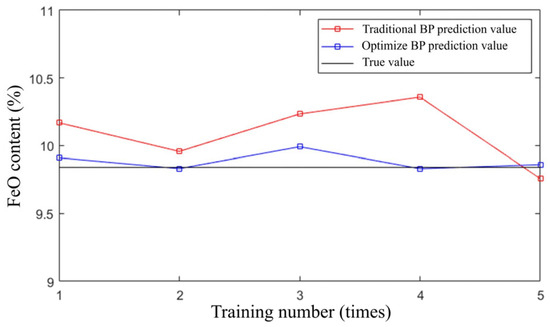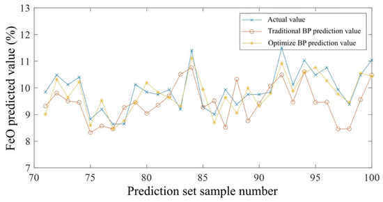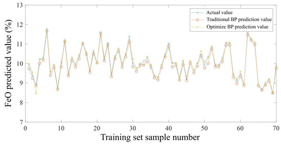 Second, in order to verify the computational accuracy of the optimized BP neural network, three performance indicators were calculated separately on the training set and prediction set and compared with the traditional BP neural network. Figure 20 shows the calculation results of FeO content in sintered ore corresponding to the training set, which verifies the training ability of the model.