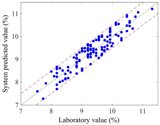 It can be seen from Table 4 that the prediction time of the system is about 2 h earlier than the test time, which can predict the FeO content of sinter in a relatively timely manner. An error analysis was conducted on all 120 sets of data, and the results are shown in Figure 22. A scatter plot was plotted with chemical detection values on the horizontal axis and the system-predicted values on the vertical axis. The solid line in the figure represents the situation where the predicted value is consistent with the actual value. The closer the sample point is to the solid line, the smaller the error. The dashed line in the figure represents the allowable error range of the system.