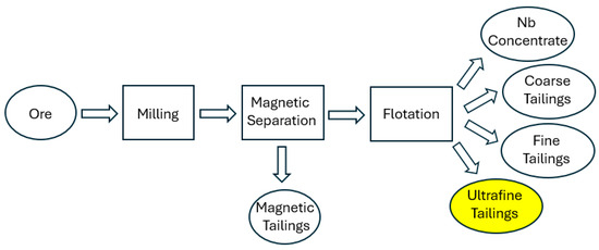 The annual production of FeNb is around 100 kt and the approximate amount of ultrafine tailings generated is 13 t/t FeNb. This material, which presently is used in dams, contains ~50% iron oxides (goethite and hematite), ~6% total rare earth oxides and ~1.5% niobium oxide. The disposal of these tailings is a significant environmental burden, as well as a waste of valuable mineral resources.