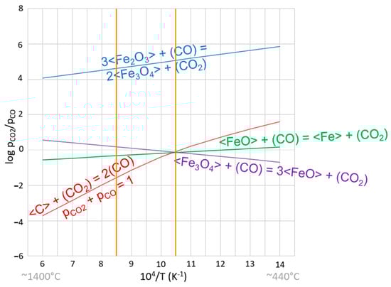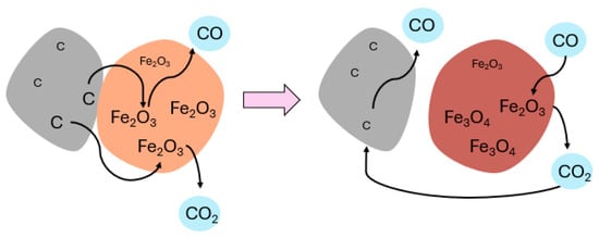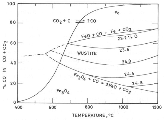 The formation of CO through the Boudouard reaction is favored with the increase in temperature, as shown in Figure 2 [3] and Figure 3. Since gas–solid contact (CO(g)–Fe2O3(s)), represented by reaction (2), is naturally greater than solid–solid contact (C(s)–Fe2O3(s)), represented by reactions (1) and (3), the reduction by carbon occurs mainly by the gas–solid contact presented in reaction (2) [4].