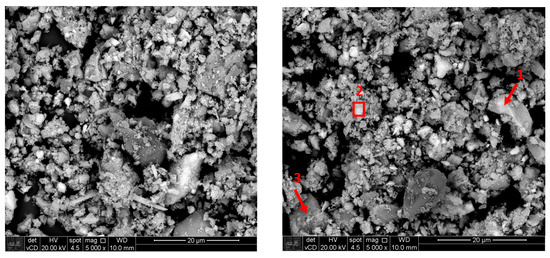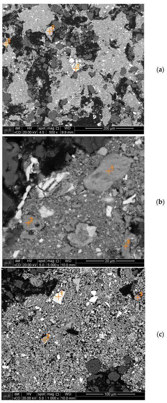 Figure 6 shows backscattered electron images of sample as-received and after calcination. Semi-quantitative energy dispersion spectroscopy (EDS) analysis was carried out on particles of the calcined sample, as presented in Table 6, which shows particles rich in Nb (Figure 6, point 1, likely pyrochlore), rare earths (Figure 6, area 2, probably monazite) and iron with impurities (Figure 6, point 3).