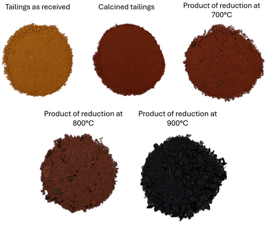 Macroscopic images from the raw material and products are shown in Figure 7. The colors of these materials are related to the typical color of goethite, hematite and magnetite, which are yellowish brown, light to dark red, and black, respectively [16]. Goethite is the major mineral phase on the as-received tailings, according to the XRD results in Table 5. The XRD results presented in Figure 8 and Figure 9 and Table 7 show that hematite is the major mineral phase in the calcined tailings, as well as in the products of reduction at 700 °C and 800 °C, while the product of reduction at 800 °C already presents a quantifiable amount of magnetite, making it a darker shade of brown. Finally, the major mineral phase in the product of reduction at 900 °C is magnetite (Table 7), which makes it the darkest color of the group, black.