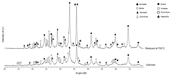 Diffractogram of the reduction product at 700 °C compared to calcined concentrate.