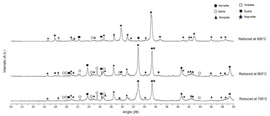 XRD analysis reveals that the characteristic peaks of magnetite start to appear in the reduction products at 700 °C (Figure 8), at 2θ equal to 18.3°, 30.1°, 35.4°, 37.0 and 43.0°. These characteristic peaks appear with higher intensity in the samples reduced at 800 °C and 900 °C (Figure 9).