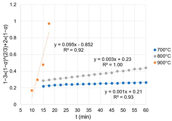 Some kinetic curves are shown in Figure 11. As the reaction at 900 °C was at least one order of magnitude faster than at 800 °C and two orders of magnitude faster than at 700 °C (see Figure 11 and Table 10), there are fewer data points for 900 °C. The precision of the scale was 1 × 10−4 g, so it is not possible to show any error bars.