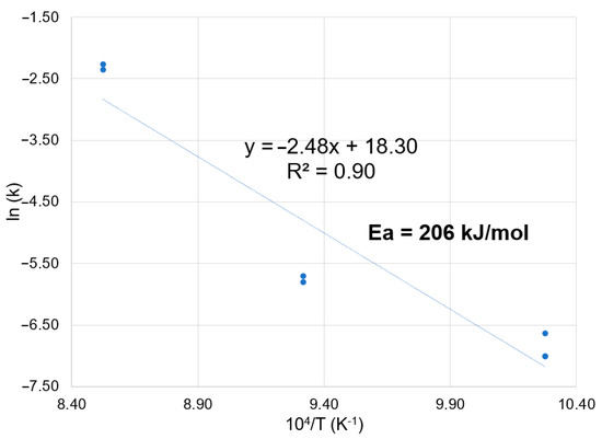 The Arrhenius plot presented in Figure 12 considered data from the three trials at 700 °C, two trials at 800 °C and two trials at 900 °C.