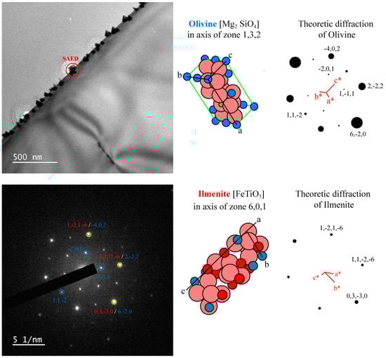 where Ol is olivine, L1 is boundary melt in association with the growing olivine (Ol, α-(Fe,Mg)2(Si,Ti)O4), and Ilm is ilmenite ((Fe,Mg)(Ti,Si)O3). A trigonal–rhombohedral crystal system, with a space group of R-3 H, characterizes Ilm, whereas an orthorhombic–dipyramidal crystal system, with a space group of Pnma, distinguishes olivine. In our experimental samples, the examined olivine-rich zone, which has a newly formed olivine lattice orientation of (010), is epitaxial, with ilmenite having an orientation of (210). In the second zone, the olivine orientation of (132) is also epitaxial, with ilmenite having an orientation of (601) (Figure 1 and Figures S3–S5). The lattice mismatch between olivine with a lattice orientation of (010) and an ilmenite orientation of (210) in the investigated experimental system is calculated to be 23.8% (Figure S6). In previously investigated natural systems [10,11,13,23], olivine lattice orientations of (100, 010, and 001) are also epitaxial with ilmenite, resulting in ≤3% mismatch with the olivine lattice.