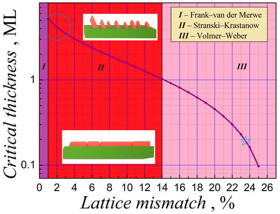 A kinetic model of the critical thickness of the transition from 2D layer growth to 3D nano-island growth in the ilmenite–olivine system at 1300 °C as a function of lattice mismatch. The possible growth modes are distinguished by different colors: I—Frank–van der Merwe mode (lattice-matching layer growth); II—Stranski–Krastanow mode (transition from layer to island growth); III—Volmer–Weber mode (island growth). The star symbol corresponds to the experimental mismatch obtained in this work; the circled area denotes the mismatches used [23]. A comparison between the curves for 1300 °C and 1000 °C (see Figure S7) suggests that the 300 °C temperature change is insignificant for high mismatches and leads to no more than 10% critical thickness increase for low mismatches.