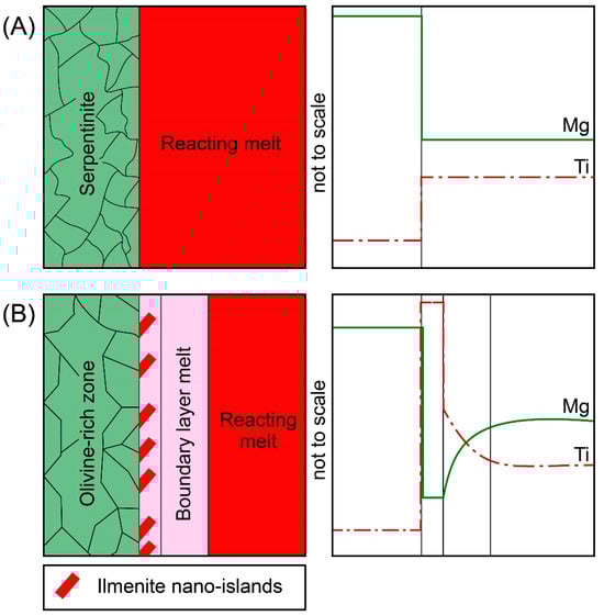 A principal schema of the ilmenite–olivine assemblage formation in the mantle–crust transition zone and mantle lithosphere due to an open system reaction between hydrated peridotite rock and basaltic melt. (A) An initial reaction of the serpentinized rock with a reacting melt or fluid. (B) The final formation of an olivine-rich zone with ilmenite nano-islands associated with boundary layer melt or fluid.