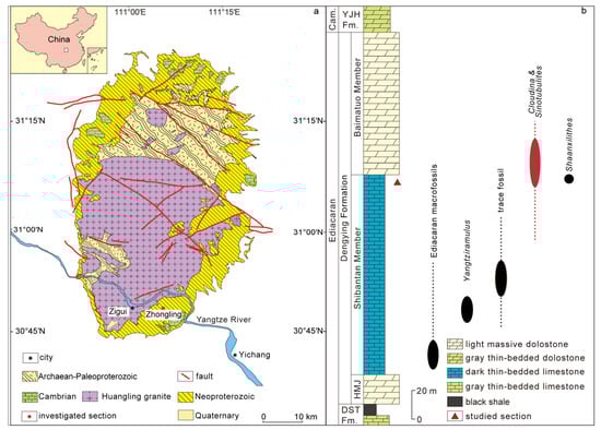 Location and stratigraphic column of the studied section in Huangling Anticline of Yangtze Platform (modified from [44]). (a) Location of the Zhongling section in Huangling Anticline. (b) stratigraphic column of the Zhongling section, YJH Fm. is short for Yanjiahe Formation. DST Fm. is short for Doushantuo Formation, Camb. is short for Cambrian. Colorful ellipses mark the known distributions of fossils while dashed lines suggest inferred their ranges.