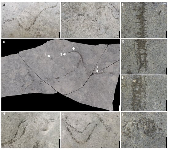 Calcium Carbonatitic Sinotubulites from the Shibantan Member of Dengying Formation at the Zhongling section in Huangling Anticline. (a) Specimen showing the tubular and curved morphology, sample No. 20ZLAZ021. (b) Specimen showing the tubular morphology, sample No. 20ZLAZ022. (c) Top view of one hand specimen with two large specimens preserved, sample No. 20ZLAZ001. (d) Specimen showing two specimens with tubular and curved morphology, sample No. 20ZLAZ023. (e) Specimen showing two specimens with tubular and curved morphology, sample No. 20ZLAZ025. (f) Proximal view of (c) showing the transverse ridges. (g) Proximal view of (c) showing the transverse ridges. (h) Proximal view of (c) showing the transverse ridges. (i) Proximal view of (c) showing the transverse ridges. Scale: (c) is 10 mm, the rest are 1 mm.
