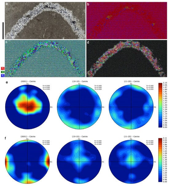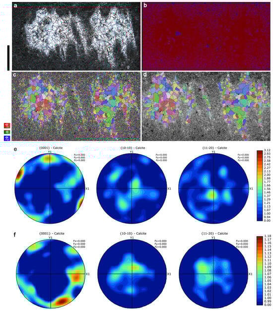 EBSD analysis was subsequently conducted on the thin sections to obtain crystallographic information. During the experiment, measurements were performed using an FEI Quanta450 field emission scanning electron microscope (Thermo Fisher Scientific, Bend, OR, USA), an Oxford Symmetry S3 EBSD high-speed detector (Oxford Instruments, Abingdon, UK), a CMOS high-resolution camera (Oxford Instruments), and an UltimMax energy-dispersive spectrometer (Oxford Instruments). The operating conditions included high vacuum, an accelerating voltage of 20 kV, a current of approximately 130 μA, a tilt angle of 70°, a working distance of 20 mm, and a beam diameter of 6.0 μm. Data acquisition and calibration were performed using the Oxford AztecCrystal software (version 6.1). The pattern resolution was set to 156 × 128 pixels or 622 × 512 pixels, with a gain of 2, and the step size was adjusted between 5 and 10 μm based on the grain size of the sample. The post-processing of the data was also conducted in AztecCrystal, with data quality controlled to ensure a maximum MAD (Mean Angular Deviation) value of 1.0 and grain orientation differences exceeding 10°, ensuring the accuracy and reliability of the results. To facilitate a clearer analysis of the crystals in the fossil wall and internal regions, EBSD data were refined by excluding crystal particles smaller than 100 μm (Figure 3d). Due to the limited presence of dolomite grains in the fossil area (Figure 3b), orientation analysis was performed only on calcite crystals. The calcite grains in the fossil and surrounding matrix were projected onto the {0001}, {1010}, and {1120} planes, and pole density diagrams were generated (Figure 3e,f).