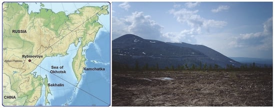Figure 1. The geographic location and photo of the Ryabinovoye deposit (photo by L.A. Lenev https://webmineral.ru/deposits/photo.php?id=4282, accessed on 13 May 2025).