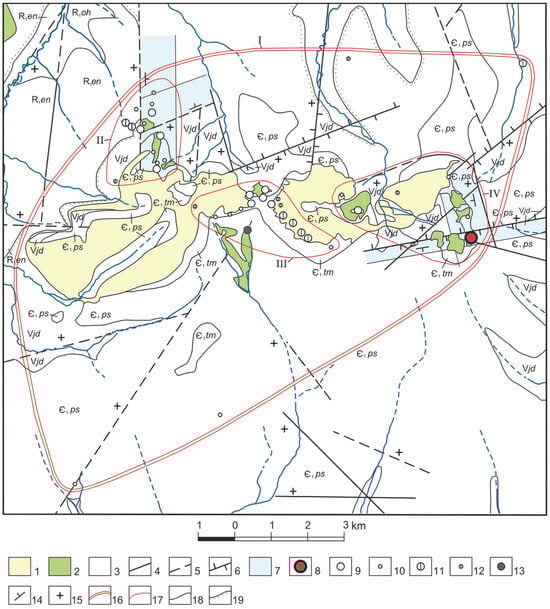 Figure 2. Structural–metallogenic scheme of the gold ore cluster (based on data [62]). 1—derivatives of the Ket-Kap intrusive complex, which are paragenetically associated with gold mineralization (monzonites, quartz monzonites—μ3, qμ3K1k); 2—pre-metallic derivatives of the Ket-Kap intrusive complex (diorites, monzodiorite and their quartz varieties—δ2, μδ2, qμδ2K1k); 3—riphean-lower Cambrian terrigenous-carbonate deposits (??) of the platform cover (omakhtinskaya—R1 oh, enninskaya—R1 en, yudomskaya—V jd, pestrotsvetnaya—Є1 ps, tumuldurskaya—Є1 tm formations); 4–6—discontinuities: discovered (4), assumed from geological (5) and geophysical (6) data; 7—flexures in sedimentary formations; 8–13—gold ore objects: skarn deposits (8), ore occurrences (9), mineralization points (10); hydrothermal ore occurrences (11) and mineralization points (12); ore occurrences of unclear genesis (13); 14—bedding of rocks on the flexure ledge; 15—relatively elevated block of rocks along the discontinuity; 16–17—contours of metallogenic taxons: Tassky (I) gold ore cluster (16) and ore fields (17)—Tarannakh (II), Vodorazdel (III), Ryabinovoye (IV); 18–19—contacts of stratified formations: concordant (18) and stratigraphically nonconcordant (19).