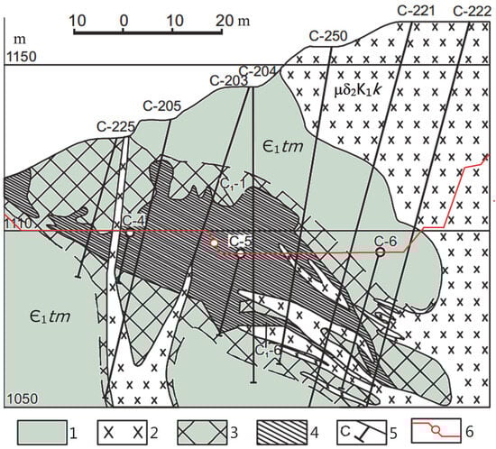 Figure 3. Geologic section of the Severnoye ore body, Ryabinovoye deposit (based on data from [23,62]. Notations: 1—Lower Cambrian carbonate sediments (Є1 tm), 2—Early Cretaceous monzodiorites (μδ2K1k), 3—skarns, 4—ore body, 5—column wells and their numbers, 6—outline of the open pit 1 and sampling site.