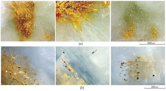 In this work, we studied lump ore samples from the Ryabinovoye deposit, taken from the open pit of the Severnoye ore body (Figure 3). Fragments with visible gold were chosen from a collection of 12 samples of tremolite–diopside skarns ore. Polished sections of selected fragments were obtained after grinding and polishing the surfaces with alcohol emulsions of diamond pastes with decreasing grain size, followed by further washing of the surface with ethylic alcohol.