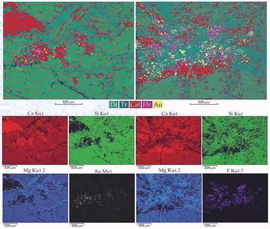 Figure 5. Distribution of mineral phases—diopside, tremolite, calcite, fluorite, and native gold in the zones of tremolite compact accumulations. Images obtained in the reflected electron mode with superimposition of maps of distribution of characteristic X-ray radiation, and distribution maps of the corresponding chemical elements over the scan area. Note: diopside (Di), tremolite (Tr), calcite (Cal), fluorite (Flr), native gold (Au). Here onwards, mineral abbreviations are given in accordance with the recommendation of the International Mineralogical Association [64].
