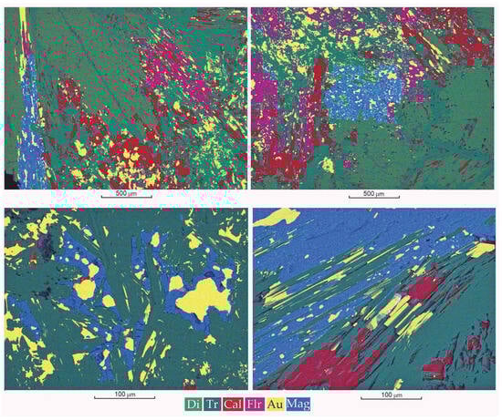 Figure 6. Distribution of mineral phases in the zones of tremolite (Tr) compact accumulations with magnetite (Mag), native gold (Au), diopside (Di), calcite (Cal), and fluorite (Flr). Images obtained in the reflected electron mode with superposition of maps of distribution in characteristic X-ray radiation.