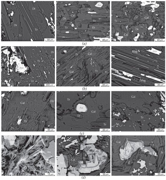 Figure 7. Morphology of native gold (Au) and features of contact interactions with diopside (Di), tremolite (Tr), calcite (Cal), fluorite (Flr), magnetite (Mag), wollastonite (Wo), and sphalerite (Sp): transition zone from diopside grains to tremolite segregations (a), multidirectional growth of tremolite crystals and its aggregates (b), gold grains exposed after dissolution of calcite (c,d).