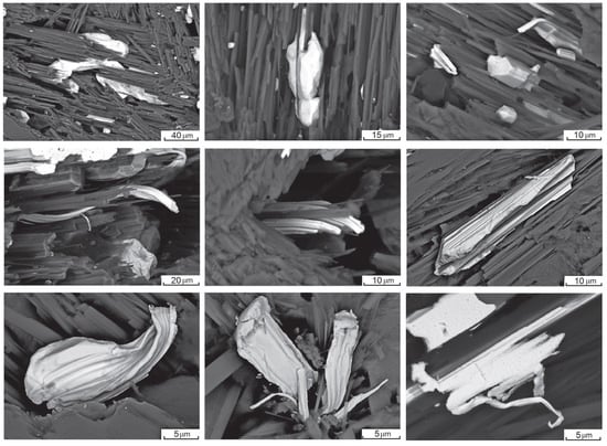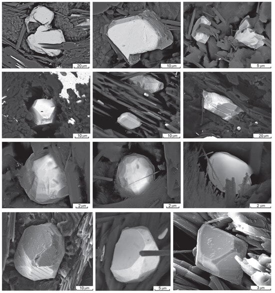 Gold content within the Severnoye ore body is 18.5 to 29.4 g/t, averaging 23.6 g/t and decreasing to 5.0–13.2 g/t in the wedging zone [23]. Native gold is high fineness (986–999‰), with the admixtures of silver, copper, and zinc [23]. The morphology of native gold is characterized by a great variety of shapes: submicronic needle-shaped gold particles, both scattered and assembled into sheaf-like aggregates, faced cubic and octahedral microcrystals, and socket-like aggregates. These morphological varieties are present together [22].
