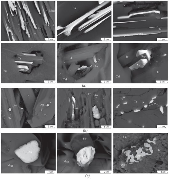 Figure 9. Morphological and microstructural features of gold (Au) microparticles intergrown with diopside (Di), tremolite (Tr), calcite (Cal), fluorite (Flr), magnetite (Mag), and serpentinite (Srp): change in the shape of needle-shaped gold particles during the transition from the zone of limited growth (intercrystalline spaces of tremolite) to the zone of free growth (a), gold particles on the growth points of tremolite crystals and in the intergranular space of structure-less tremolite (b), magnetite and fluorite (c). Morphostructural features of gold particles at the contact with tremolite crystals. SE, BSE images.