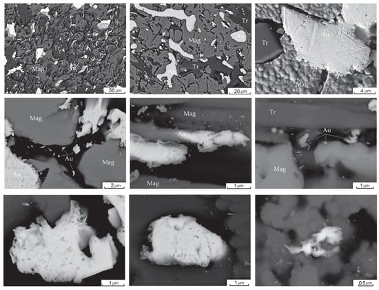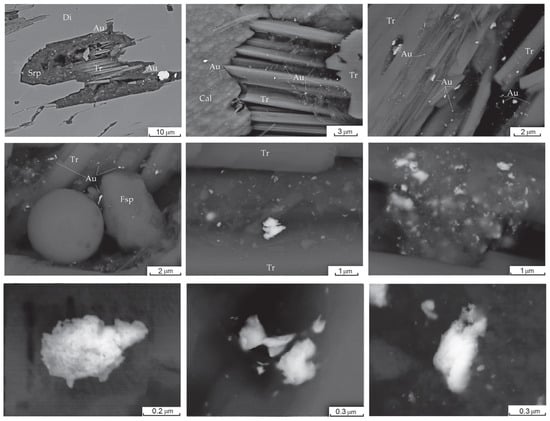 The analysis of electron microscopic data shows that native gold is associated with all minerals of tremolite nests (Figure 7). It was found along the boundaries of intergrowths of tremolite crystals and diopside grains, forming interpenetrating transition zones at the nest boundaries in direct intergrowth with tremolite crystals (Figure 7a,b). Gold fills multi-scale voids formed by the multidirectional growth of tremolite crystals and the intercrystalline spaces of its sheaf-shaped aggregates (Figure 8). It is present in calcite and fluorite (Figure 7c,d), aggregates with magnetite (Figure 9), sphalerite (Figure 7c), and contains microinclusions of sulfides (pyrrhotite and galena), clinohumite, and other magnesian silicates, and also forms tremolite–gold microheterogeneous aggregates (Figure 8).