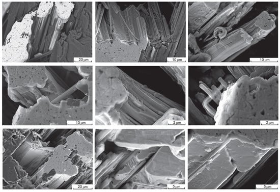 Modes of imaging (accelerating voltages of 10–20 keV, working distances, signal detection, and sample tilt) and processing were chosen depending on the task and features of the samples. Microimages were obtained in the modes of the secondary (SE) (contrast because of topography), reflected (BSE) (compositional contrast because of the differences in the average atomic number of phases), and mixing of signals from secondary and reflected electron sensors (BSE + SE). X-ray spectral determinations of the chemical composition of phases were carried out by points and rectangular microregions, as well as by the scanning area (full frame) in the form of maps of the distribution of characteristic X-ray radiation of certain wavelength intervals, taking into account the effect of superposition of peaks from different elements.