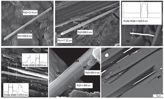 Fine-phase heterogeneity in the form of submicroscopic inclusions of silicate phases is frequently observed on the polished surfaces of gold particles (Figure 8 and Figure 11). The shape of prismatic and rounded gold needle-shaped crystals in the intercrystalline spaces of silicate minerals is determined by the volume of available space for gold deposition and subsequent recrystallization processes, resulting in the induction surfaces on gold particles formed at contact with the host minerals. The needle-shaped gold individuals have cross-sectional dimensions of 100–600 nm, with a predominant size feature of~350 nm and lengths up to 150 nm (Figure 12). The gold grains are subhedral, not completely bounded by crystal faces, and are located at the boundaries of the intergrowth of hard silicate minerals and soft redeposited calcite. The appearance of crystal face surfaces is the result of both crystalline ordering of gold particles and contact interactions with the crystalline surface of tremolite with the formation of the induction surface on native gold grains (Figure 7, Figure 8 and Figure 9).