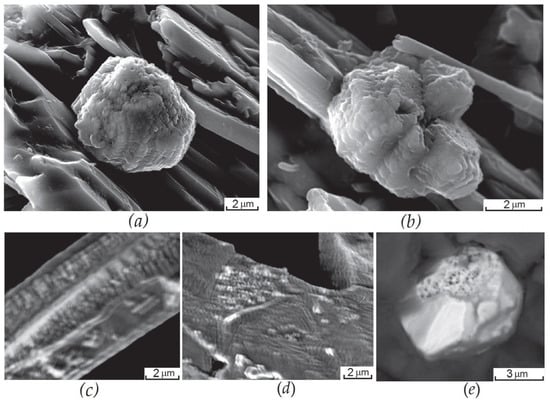 In most gold grains, zones with the relics of a globular structure are observed. The microstructure of native gold is formed by successive aggregation of globular particles with subsequent accretion, compaction, and formation of a surface layer. At the same time, there are both relatively loose structures with clearly visible boundaries of the constituent particles and grains with pronounced smooth edges, as well as a significant number of intermediate forms. There are individual gold particles with crystal faces, but their internal structure remains nanoporous (Figure 14e). This implies that, though they are external crystals, no real ordering in gold particles occurred. Thus, regardless of whether the grains of native gold were formed from needle-shaped crystallites or have a crystalline facet, their internal structure is not dense.