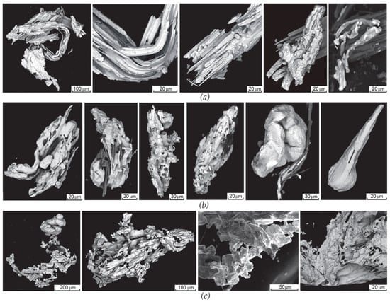 Figure 16. Morphological and microstructural features of gold particles extracted by chemical dissolution from tremolite–diopside skarns: clusters of thread-like, needle-shaped, and flattened individuals (a), volumetric aggregates of various degrees of intergrowth of primary grains (b), openwork aggregates (c). BSE images.