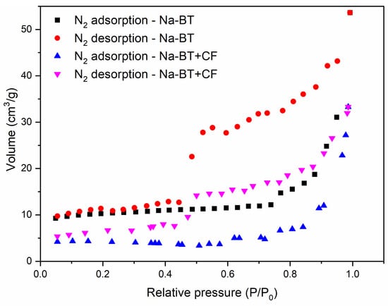 Nitrogen adsorption and desorption isotherms for Na-BT and Na-BT+CF.