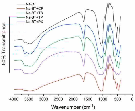 The bands present in the FT-IR spectra of Na-BT are characteristic of bentonites, with montmorillonite as the dominant mineral (Figure 2): 3623 cm−1 corresponds to the stretching of the OH groups present in the lamellar structure; 3448.33 and 1638.23 cm−1 to the stretching and bending, respectively, of H–O–H from water molecules located in the interlayer region; 1047.23 cm−1 to Si–O stretching; 917.02 cm−1 to Al–Al–OH bending; 798.17 cm−1 may indicate the presence of quartz in the sample; 624.39 cm−1 corresponds to the out-of-plane vibrations of coupled Si–O and Al–O; and 523.59 and 467.18 cm−1 are attributed to the bending vibrations of Al–O–Si and Si–O–Si, respectively. The FT-IR spectrum after CF, PX, TB, and TP adsorption did not show significant changes, except a slight decrease in the signal intensity at 1638 cm−1, which may be associated with band broadening due to the overlap of signals related to the H–O–H bending of water molecules and the stretching of C=C and C=O bonds present in caffeine and metabolites (commonly observed in the region between 1650 and 1700 cm−1, respectively). This is consistent with the findings of Oliveira et al. [22] because the FT-IR spectra for their thermally modified bentonite before and after CF adsorption were very similar.