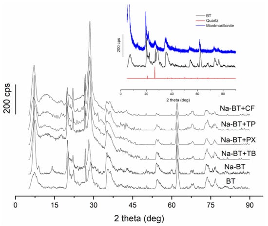 The diffraction pattern obtained for BT follows the expected result for montmorillonite (Figure 3), which is the main component of bentonites, showing characteristic diffraction peaks at 2θ values of 6.72°, 20.22°, and 35.32° [37]. The peak near 30° is associated with the quartz in the sample. Hai and colleagues found a similar result for raw bentonite [16]. The insert in Figure 3 shows the diffraction pattern for BT compared to reference ones for quartz and montmorillonite [38]. The basal spacing (d001), which was determined on the first peak in the diffractogram of BT at 7.22°, corresponds to 12.23 Å. After treatment with NaCl, the first diffraction peak of Na-BT appeared at 7.12°, corresponding to a basal spacing of 12.40 Å. This modest increase in spacing can be attributed to the higher hydration energy of Na+ ions compared to divalent cations that may have originally occupied the interlayer space. Sodium ions strongly attract water molecules, and their high hydration energy promotes the incorporation of water into the interlayer region. As a result, the hydrated Na+ ions expand the interlayer spacing by pushing apart the tetrahedral–octahedral–tetrahedral layers.
