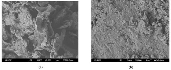 Micrographs obtained for Na-BT before and after caffeine adsorption are shown in Figure 4. Before adsorption, bentonite’s layers, pores, and irregular structure are easily observed. Yang et al. [41] found a similar lamellar structure in their sodium-modified bentonite. After adsorption, the clay mineral is much less rough with less visible pores, thus indicating the pores were occupied with caffeine, which is consistent with the findings of the BET and BJH measurements. Oliveira et al. [21] found similar results for caffeine adsorption in their thermally modified bentonite.