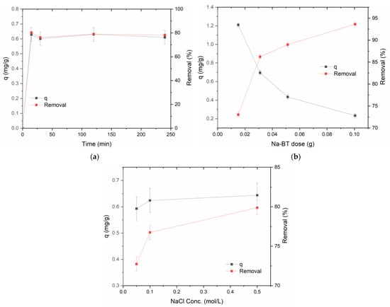 The influence of (a) contact time; (b) adsorbent mass; and (c) ionic strength on the adsorbed amount (q) and the removal % of caffeine from a 5 mg/L solution. The experiments in A and C used 30 mg of Na-BT.