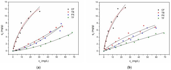 The Freundlich equation (Equation (5)) fitted the data satisfactorily (R2 > 0.90) (Table 1), confirming the affinity order suggested by the Kd values, with a much higher affinity of CF for Na-BT. The adsorption isotherms of TB, PX, and TP as individual compounds exhibited a concave–upward shape, indicating weak interactions (Figure 6a). This shape suggests a cooperative interaction in which the weakly sorbed molecule enhances the affinity of the sorbent towards the adsorbate due to adsorbate–adsorbate interactions. This hypothesis is reinforced by the adsorption isotherms of the four mixed compounds (Figure 6b). In this case, the adsorption of CF is not affected in comparison with the individual solution, although the isotherm shapes of TB, TX, and TP assumed slightly concave (TB) or linear shapes (PX and TP), with a significant increase in KF values (Table 1). The decrease of the 1/n values indicates an enhanced affinity in comparison to the parameters found with the individual compounds.