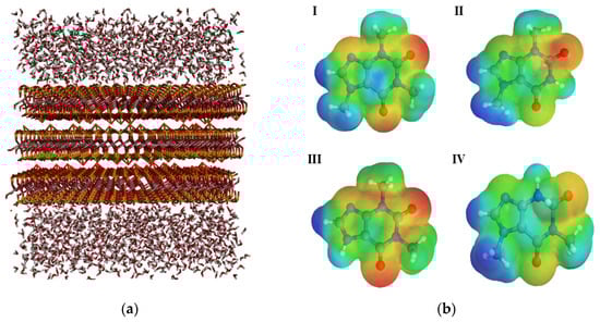 Geometrically optimized structures illustrating adsorption on the (a) bentonite surface of (b) the molecules: (I) caffeine; (II) theophylline; (III) theobromine; (IV) paraxanthine. Regions of higher and lower electronegativity are represented by warm and cool colors, respectively.