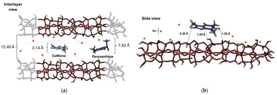 Representation obtained through molecular docking showing the interaction between the caffeine (neutral) and paraxanthine (anionic) molecules and the bentonite lamellae: (a) interlayer view and (b) side view.