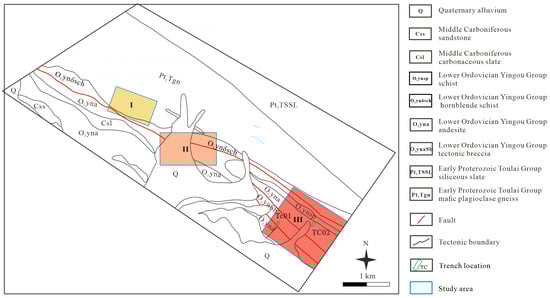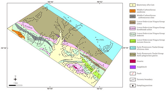The Early Proterozoic Tuolai Group (Pt1T), Lower Ordovician Yingou Group (O1yn), Middle Carboniferous (C2), and Quaternary (Q) strata are predominantly exposed within the Hongyahuo area [43,44] (Figure 2). The Tuolai Group is chiefly distributed in the northern and southern sectors of the study region and is composed of a suite of middle-high metamorphic rock, predominantly biotite plagioclase gneiss and siliceous slate. The Yingou Group extends through the central portion of the study area, trending approximately east-west. Its lithological composition typically includes gray to gray-green intermediate-mafic volcanic rocks, intercalated with crystalline limestone, hornblende schist, and biotite schist. This unit is tectonically juxtaposed against the Paleoproterozoic (Pt1T) strata via fault contact and lies unconformably over Middle Carboniferous formations. It serves as one of the principal ore-bearing horizons for iron and polymetallic mineralization in the Qilian region [45]. The Middle Carboniferous is distributed in the southeastern part of the area and consists of a clastic-carbonate assemblage, primarily comprising sandstone and carbonaceous slate. The Quaternary system is relatively well-developed, occupying the southern portion of the area, and is mainly composed of deposits associated with modern riverbeds and terraces.