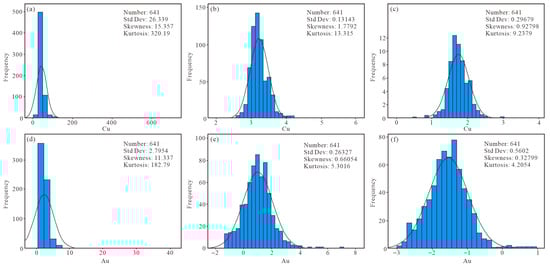 Histograms of Cu (a–c) and Au (d–f) raw data, logarithm, and ilr data transformation.
