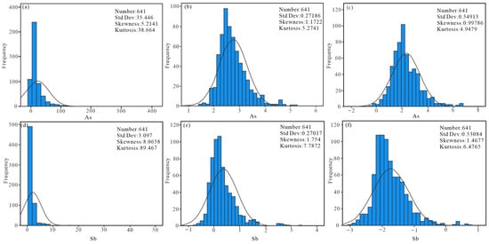 Histograms of As and Sb raw data (a–c), logarithm (d–f), and ilr data transformation (c).