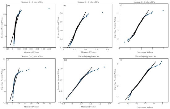 Q-Q plots of Cu (a–c) and Au (d–f) raw data, logarithm and ilr data.