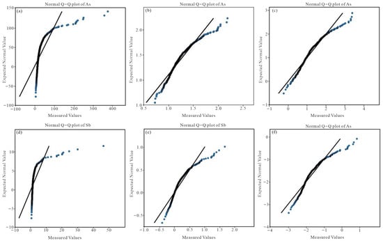 Therefore, in this paper, Cu, Au, As, and Sb elements with uneven distribution, high coefficient of variation, and high enrichment coefficient are selected for further research. Histograms presented in Figure 3a and Figure 4a reveal that the original values of these elements are characterized by elevated skewness and kurtosis, indicating clear deviations from normal distribution. Correspondingly, the quantile–quantile (Q–Q) plots illustrate substantial departures from linearity due to extreme values (Figure 5a and Figure 6a). Following logarithmic transformation (Figure 3b and Figure 4b) and ilr transformation (Figure 3c and Figure 4c), the distributions of Cu, Au, As, and Sb demonstrate improved symmetry and reduced variation in spatial distribution, thereby diminishing the influence of outliers and promoting a closer approximation to a symmetric pattern. Consequently, ilr transformation is effective in mitigating structural heterogeneity and minimizing the closure effect in compositional data, thus enhancing statistical normality. The Q–Q plots of both logarithmically and ilr-transformed datasets for Cu, Au, As, and Sb (Figure 5b,c and Figure 6b,c) indicate the presence of multiple populations within individual datasets, reflecting the impacts of distinct geological processes or events, as well as the overlapping behavior of multi-element associations.